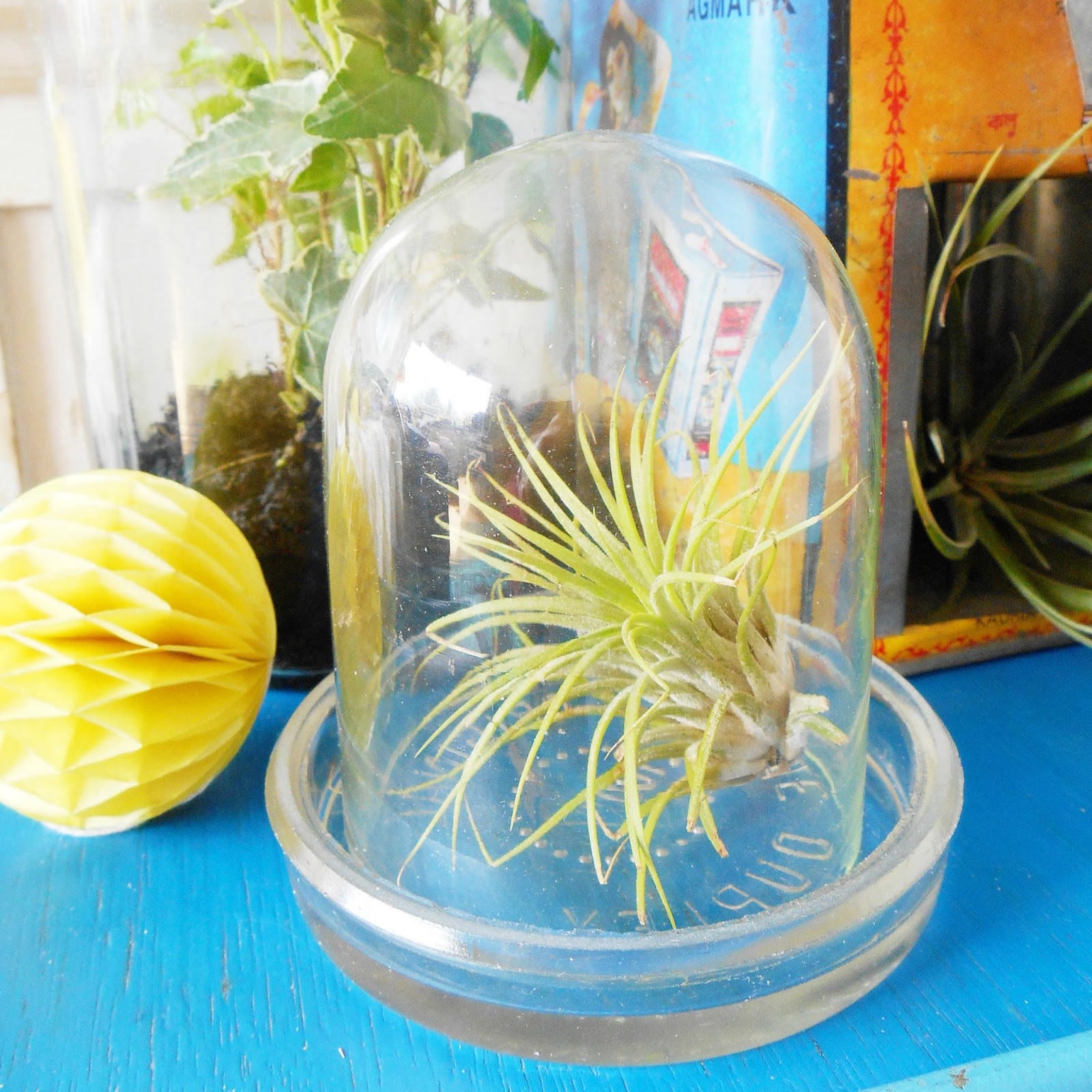 Spring is finally here! Time to bring spring into my home and I do so with glass combined with plants. I love the transparency of glass together with plants. Especially when the sunlight shines through it. I have given my air plants a new home for the next few weeks. These plants are easy to care for and fit in anywhere. I used different glasses like a shot glass, a glass bell and a jam jar. I have put the bunch on a vintage trolley that I bought a few years ago at a flea market.